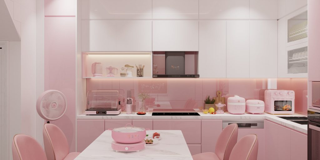 - Tủ bếp màu pastel (hồng phấn, xanh mint) kết hợp mặt đá trắng tạo vẻ đẹp hiện đại.